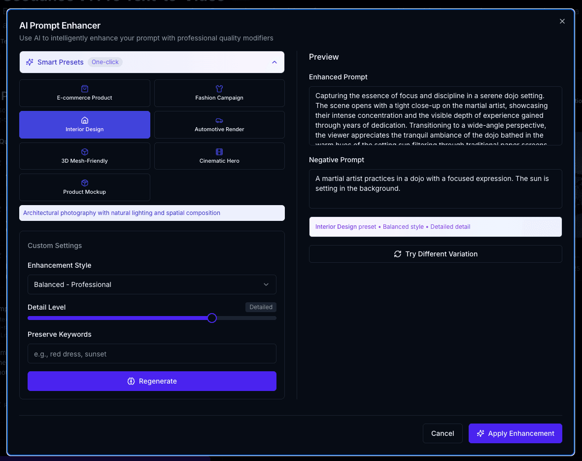 Our Prompt Enricher is designed to feel like a creative assistant, not a technical tool.